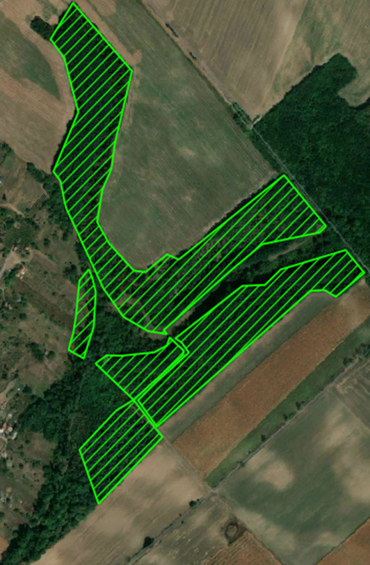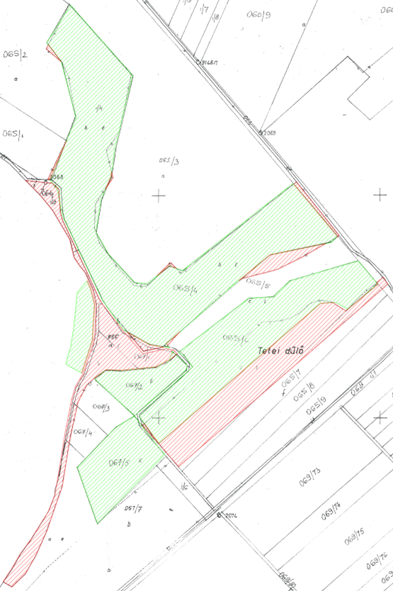 És mivel nem értettük, kutakodtunk kissé, és nem hiába! Kiderült, hogy az 1993/1995-ös védetté nyilvánítás idején a környék helyrajzi számai nem azok voltak, mint ma, ugyanis később (feltehetőleg a kárpótlás során) átrajzolódtak telekhatárok és átszámozódtak területek. Az alábbi két térképrészleten teljesen jól látszik, hogy az a terület, ami most nem áll védelem alatt, a korábbi helyrajzi számmal igenis védettséget kapott! Az, hogy ma nem áll védelem alatt, minden bizonnyal a HRSZ-módosítások során elkövetett mulasztások miatt alakult így.